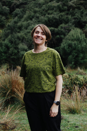 Our latest tee design on an olive green base is a celebration of some of our most iconic wildlife featuring the Kiwi, Takahē and Tuātara. Drawing inspiration from what you might find on a local bush walk we've also sprinkled in some Kawakawa and ferns throughout the design. 20% of proceeds being donated to Forest & Bird's conservation efforts.