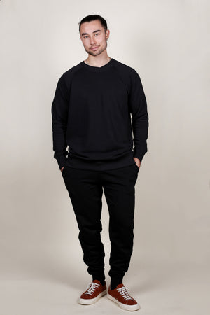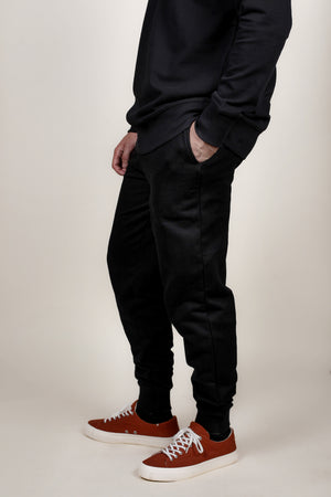 Updated natural drawstring waist. Ribbed waist and cuffs. Side welt pockets. Rib includes elastane for stretch and stability.